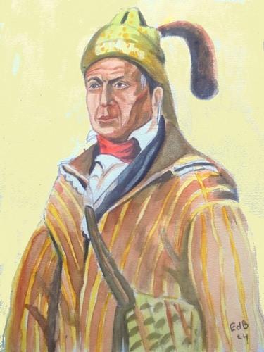 Voordat blanken handel gingen drijven met indianen en bv. de kralenversiering in zwang kwam, droegen de indianen versieringen van stekelvarkenpennen op de kleding en verierselen van been of schelp. Hierbij mijn versie van zo'n indiaan in die tijd.
