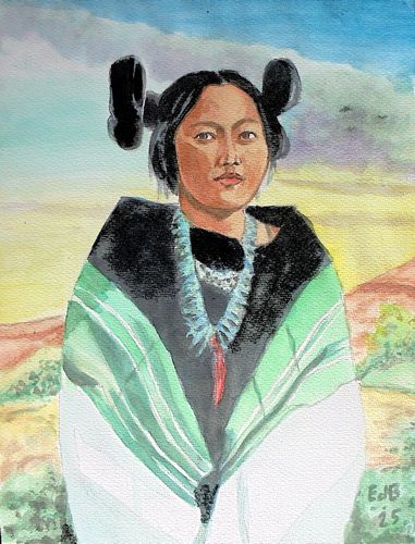Dit Hopimeisje heeft de haardracht van een ongetrouwde schone. De Hopi waren een bekend volk onder de Pueblo-indianen. Zij bewoonden permanente dorpen opgebouwd uit Adobe-huizen. Adobe is een gedroogde kleitegel. Vroeger werden de dorpen in rotsopeningen gebouwd of bovenop een plateau in dit land van tafelbergen en cactuswoestijn.